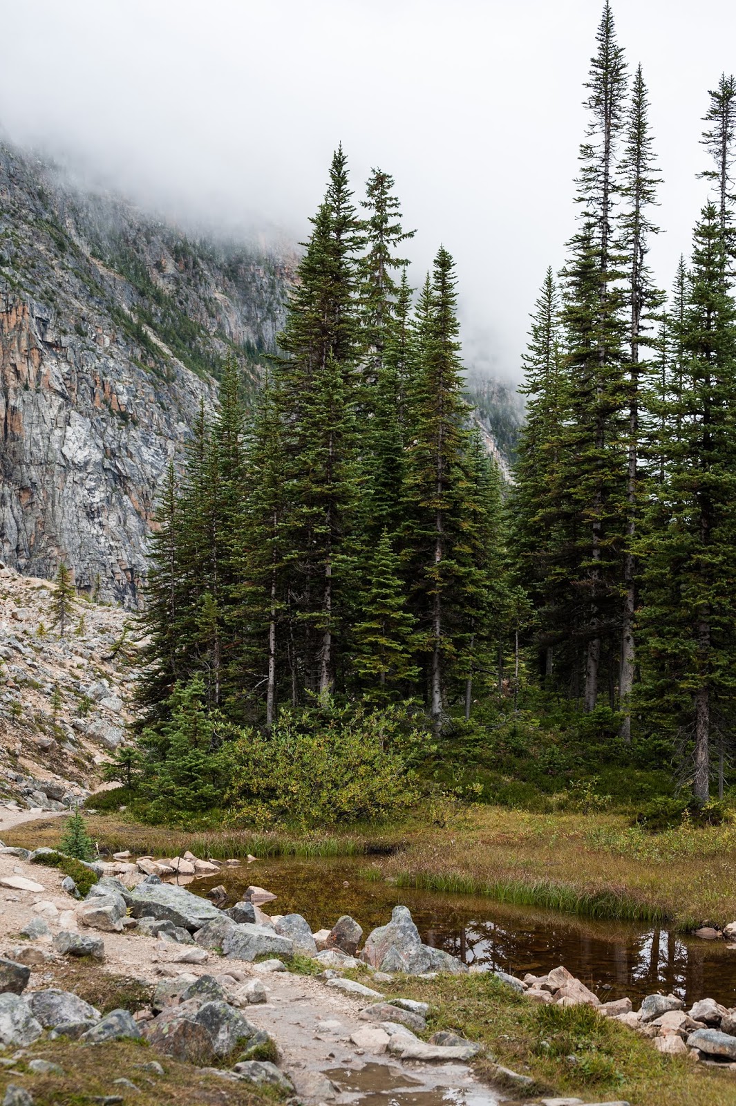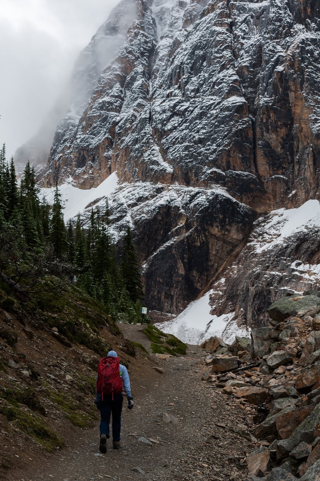 在一個溫潤的九月清晨,太陽還躲在雲層後麵不肯露麵,晨霧仍在空中輕柔地飄蕩,我們已經走在了通往天使冰川的步道上 (Edith Cavell Meadows trail)。這條步道來回1.6公裏,升高70米,難度不大。