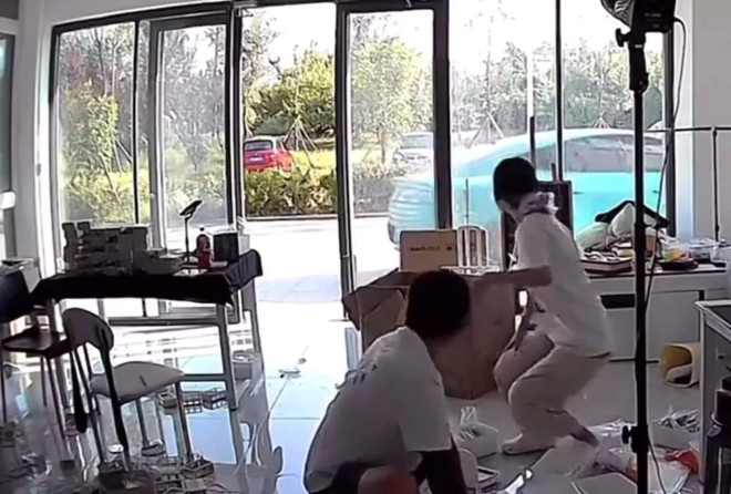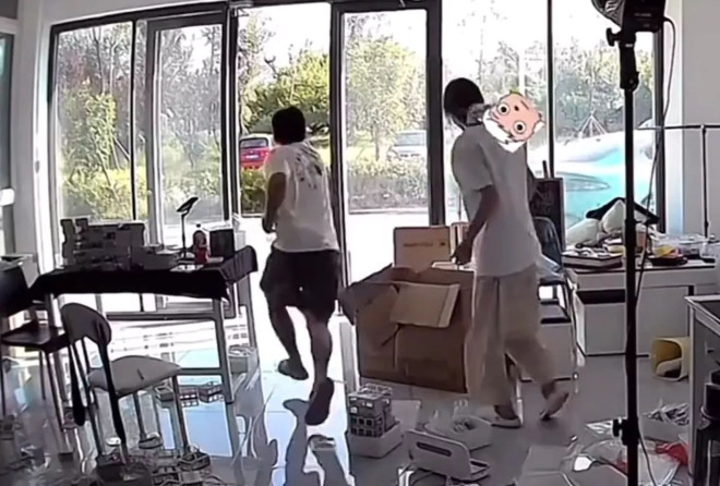 閉路電視畫麵顯示,事發時一輛小米汽車停在室外,車主和一名女子在室內工作,車輛突然啟動開走,女子見狀站起來並原地驚叫,車主也立即追上。