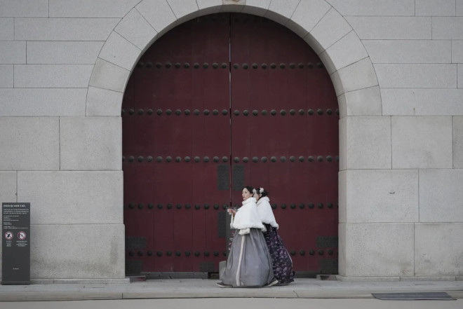 身著韓國穿統服飾(韓服)的遊客在首爾觀光景點光化門前散步。(美聯社)