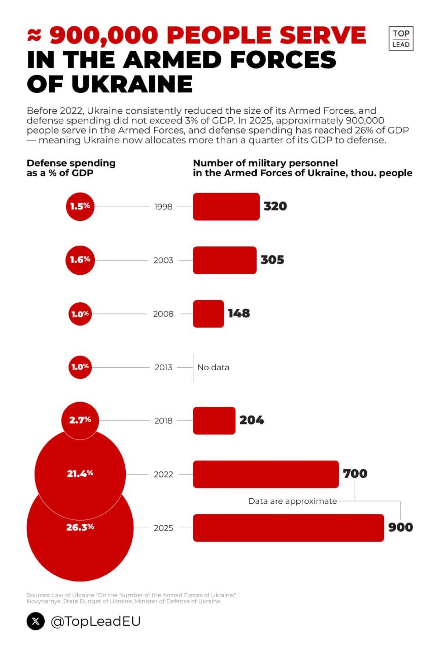 對於俄羅斯聯邦來說,駐紮在烏克蘭的綜合地麵部隊、海軍陸戰隊、私人軍事承包商(PMC)和空降部隊總數為594,000人。這個數字正在下降,考慮到之前的報道(如杜普伊研究所、2025年《軍事平衡》、Mediazona/Meduza、RUSI、CNA等)顯示約為700,000人。雙方每月征兵人數均在30,000名,但莫斯科在戰場上留下了人數要多得多。由於死亡和嚴重受傷,目前俄羅斯的不可逆損失接近120萬人,每天的傷亡人數高達千人。