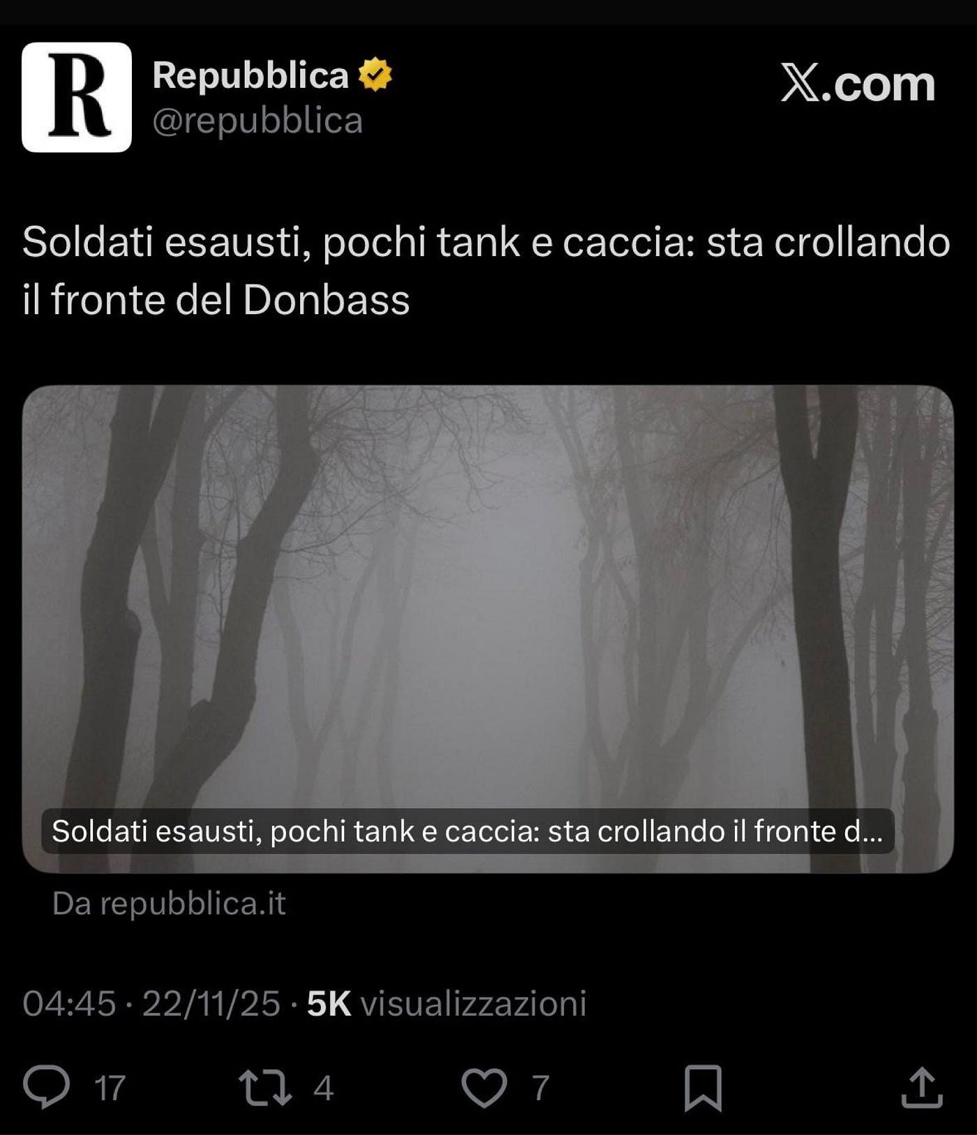 許多意大利小報反複報道稱,頓巴斯前線已經崩潰,以至於讓人懷疑它是否依然存在。我們在這個漫長堡壘的不同地方進行了數周、數月、數年戰爭的報道,甚至在此之前。就像幾個小時前在波克羅夫斯克和霍利揚波列所發生的一樣,有時我們現場描述的現實並未立即反映在地圖上,但事實證明我們是對的。這一次也一樣,我們的評估依然準確,以至於得到了頭部分析師和智庫的讚賞和引用。我們唯一功勞就是一直在這裏(前線),已經近1400天。