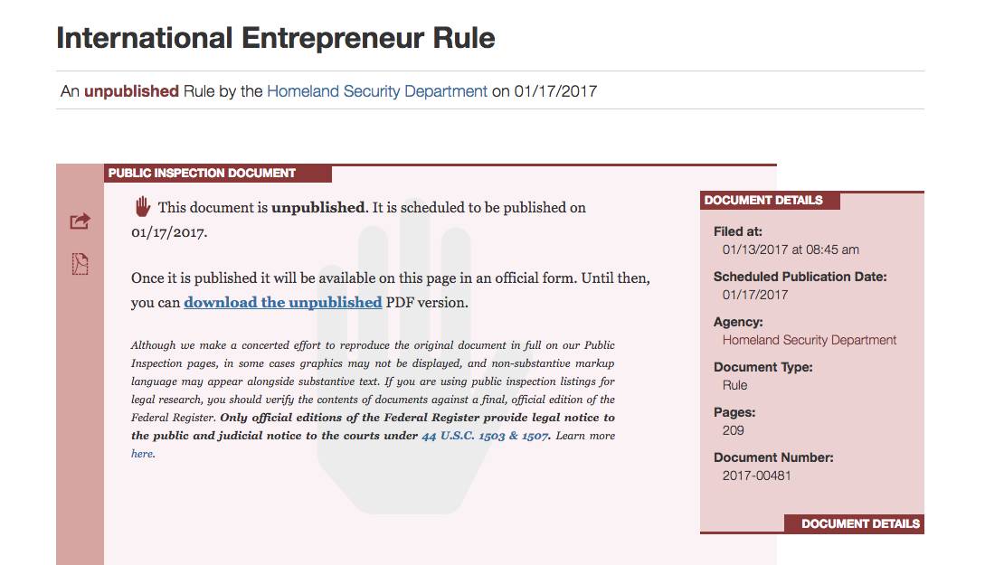 去年8月底,小紐第一時間為大家解析了有望在今年出台的EB-6創業工卡(Entrepreneur Parole)的各種利弊,不過當時說的都是國土安全部、移民局的初步提議,轉眼半年過去了,這份名為《International Entrepreneur Rule》的最終議案將於下周二,1月17日正式在聯邦公報網上開始公示。