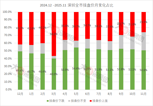 11月,深圳二手掛盤價下跌的小區占比50.6%,上漲的小區占比25.9%,幾乎不變的小區占比23.5%。