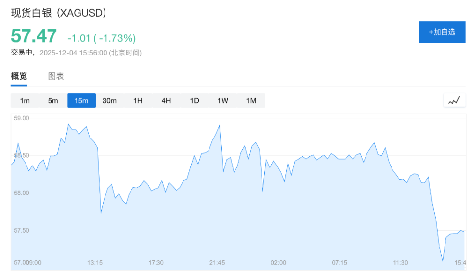 現貨黃金下跌0.2%,至每盎司4194.37美元;現貨白銀跌超1.7%至57.46美元/盎司;WTI原油漲超0.3%至59.33美元/桶