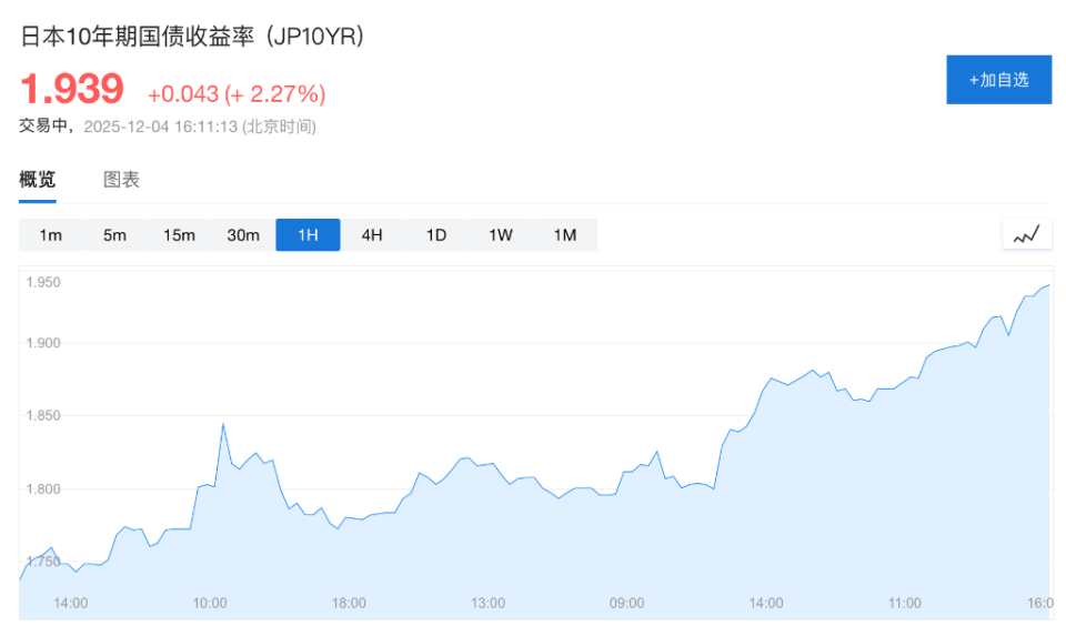 在日央行加息預期持續升溫的背景下,日本長期國債收益率近期顯著上行並刷新曆史高點,但不同期限債券走勢出現分化。據華爾街見聞,隨著市場對日本央行12月加息的預期急劇升溫,日本國債收益率全線飆升至數十年來的高點,日本30年期國債收益率一度上行2.5個基點,至3.445%,創下自1999年該期限國債推出以來的最高水平。