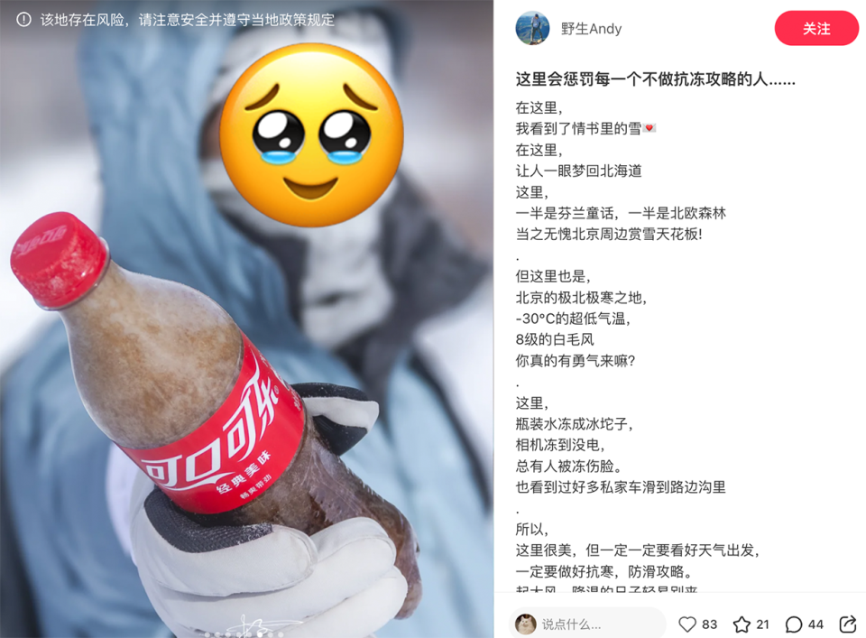 零下三十度徒步,沒帶保溫杯,可樂都成冰沙了;
