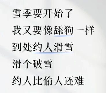 “別提了,我的朋友圈已經被戶外這幫人卷瘋了,立冬一到,朋友圈就是滑雪帥照,說什麽‘向上的生命力比皮囊更有殺傷力’。”