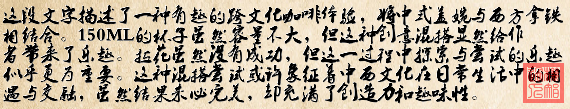 蓋碗通常用於傳統的中式茶道,而在此背景下用來盛放西式拿鐵,形成了具有創意的文化碰撞。150ML的容量說明這是一個小巧精致的組合,適合品味和欣賞。