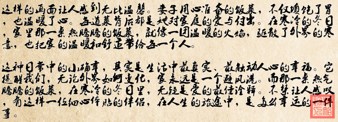 《暖光》 玻璃窗凝滿霧氣 街景模糊成水墨痕跡 寒意悄悄爬進衣領 像那年冬天離別的站台 廚房飄來蔥花的香氣 你係著碎花圍裙哼著歌曲 鐵鍋翻炒著青紅與金黃 像把彩虹裝進白瓷盤裏 木耳在熱油裏跳舞 番茄融化成一鍋晚霞 豆腐偎著白菜輕聲細語 粉絲纏繞著辣椒說情話 湯碗蒸騰的雲霧裏 蘑菇撐著傘等香菜落下 你說要燉煮整個春天 驅散我眉間積壓的雪花 相冊存著三百六十五道風景 每張都是你寫的散文詩 從青澀到豐腴的歲月 在餐桌鋪成星河萬裏 當霜花綴滿屋簷時 你用圍裙兜住所有暖意 原來幸福是這般形狀—— 碗沿升起的白霧吻過你發際
