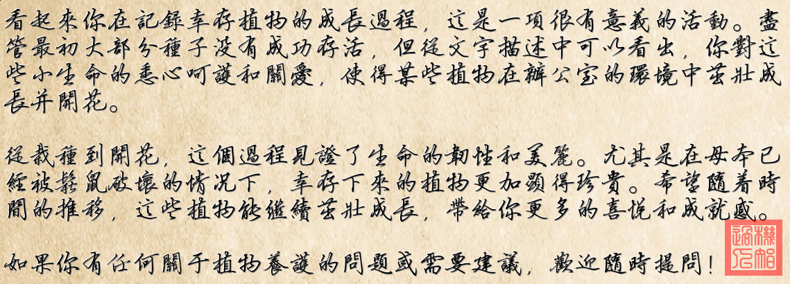 《種子的詩篇》 在濕潤土壤裏埋下希望 二百粒夢想靜靜安躺 嫩芽破土時帶著倔強 卻敵不過盛夏的灼傷 窗台那盆最頑強的綠意 舒展葉片擁抱晨光 花苞在鍵盤聲中醞釀 粉紅花瓣綻放在暮色裏 母本在庭院零落成泥 鬆鼠帶走了最後生機 新芽仍捧著露珠站立 在熒光屏前書寫續集 從破土到凋零的軌跡 每片葉子都藏著秘密 當燈光照亮深夜窗欞 新生在枯萎處綻放奇跡 那些未發芽的沉睡希望 與腐爛枝葉共釀芬芳 在循環往複的四季長廊 生命以另一種模樣生長