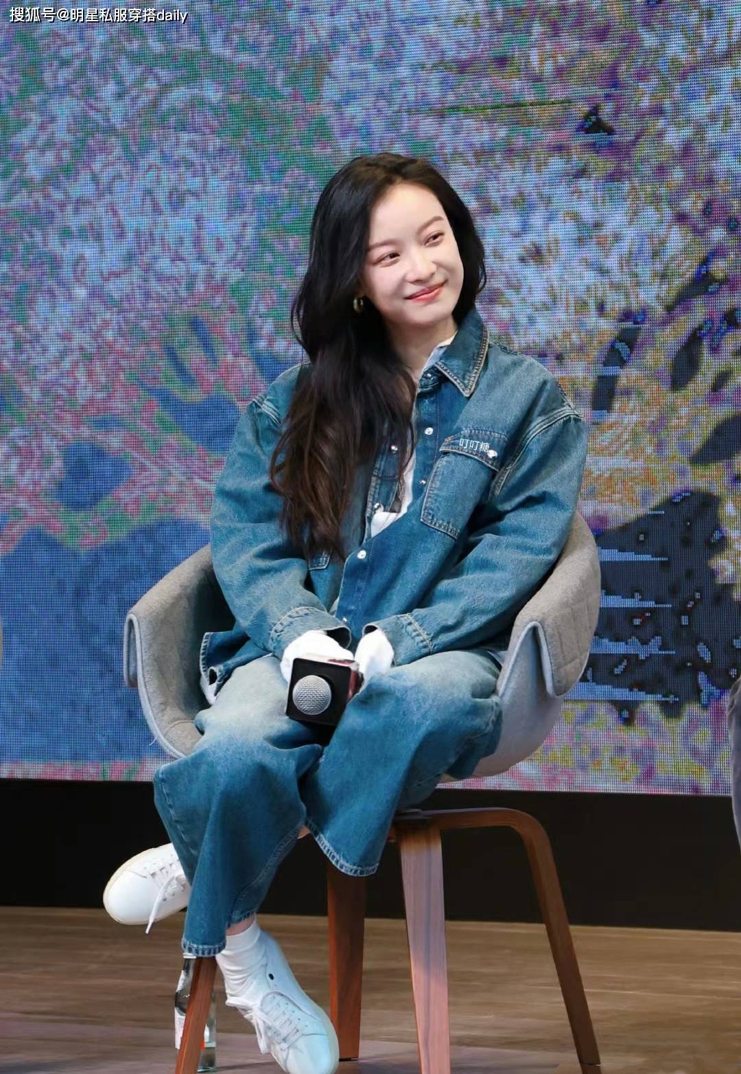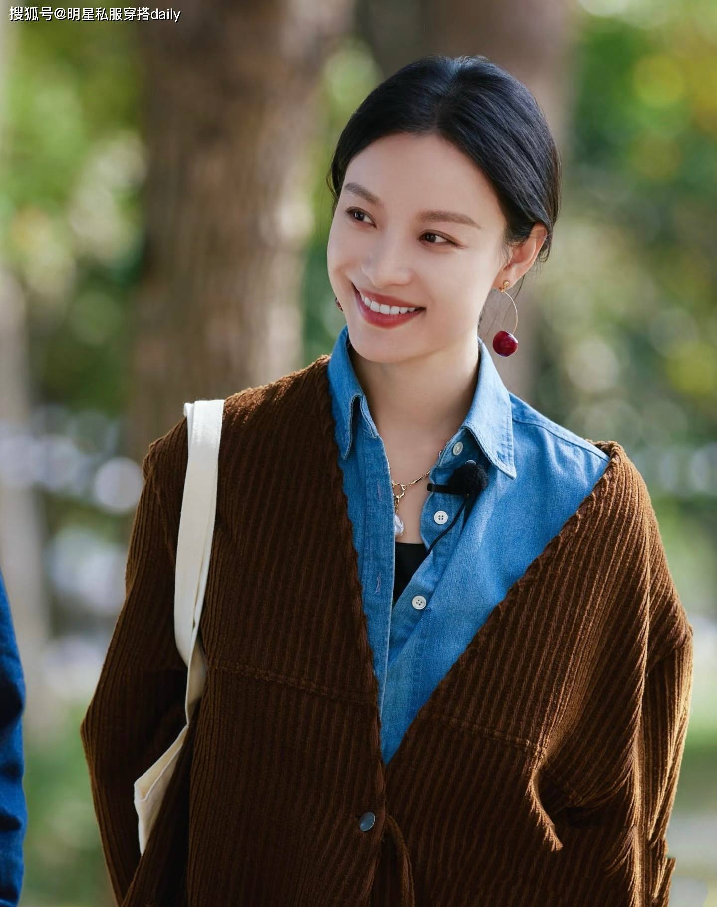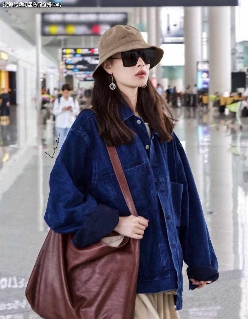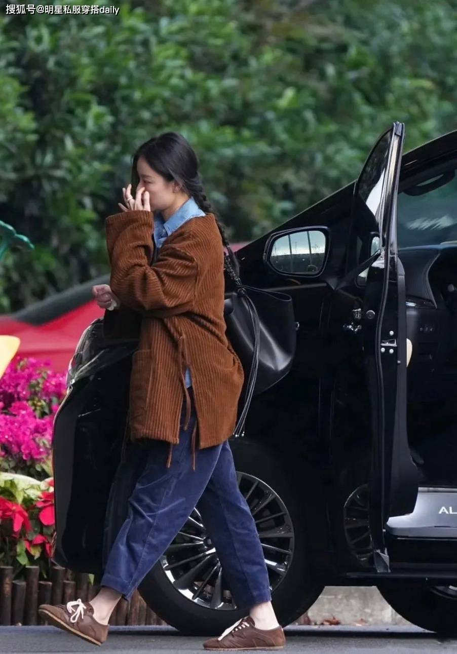 倪妮搭配棕色夾克外套,紮一個單麻花辮,美的像畫中人!下半身搭配的藍色褲子雖然麵料不同色係深淺不同,但也和牛仔襯衫相呼應,盡顯細節!