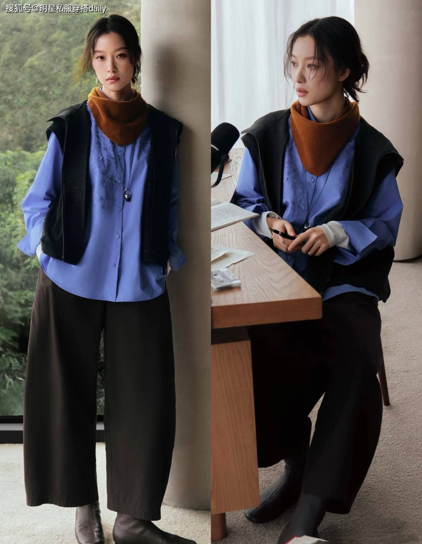 倪妮很喜歡穿寬鬆的服飾,喜歡基礎色和低飽和度色係的服飾搭配!很文藝的藍色襯衫搭配灰黑色馬甲背心,脖子上搭配棕色三角圍巾,文藝氣質拉滿!