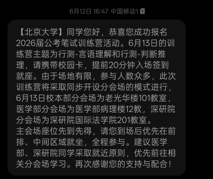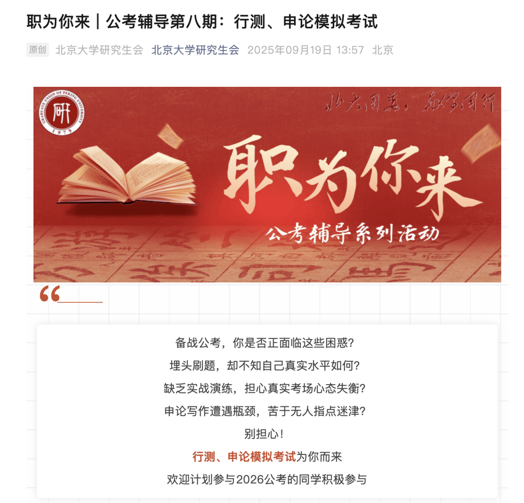 以北大的公務員模考為例,其屬於北大“公考輔導係列”就業品牌活動,北大研究生會擔任主辦方之一。9月19日,北大研究生會微信公眾號發布推文《公考輔導第八期:行測、申論模擬考試》。2024年,北大研究生會也曾開展6次線下模考。