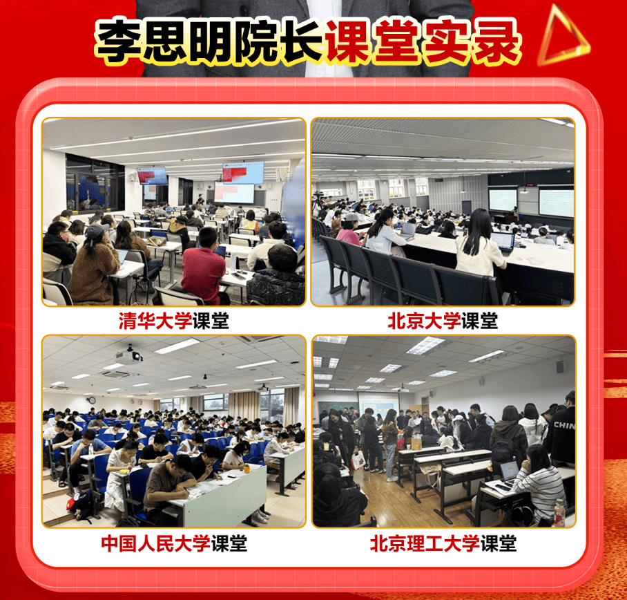廣告圖頂部是“申論能力提升院長班”的紅白大字,左側寫著“限時優惠2980元”,右側配了4張照片,是授課老師在清華大學、北京大學、中國人民大學和北京理工大學講課時,台下坐滿學生的場景。
