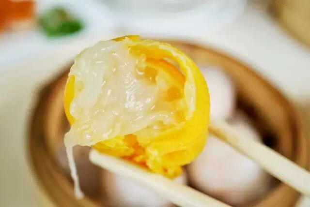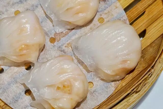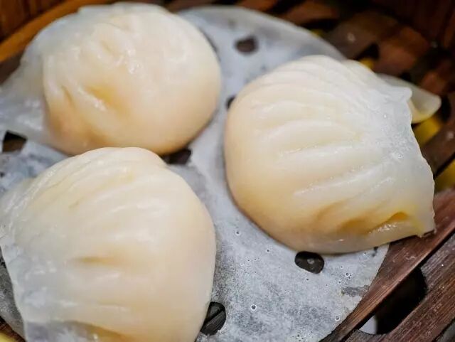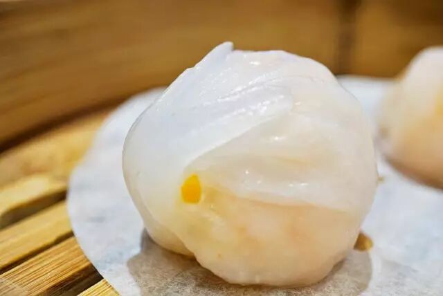 其次看皮子,要透明而有韌性,皮薄透柔韌不粘牙。蝦餃皮的狀態很大程度上取決於蒸的時間。為了防止蝦餃蒸過頭,一般茶樓都會少蒸半分鍾,這樣送到客人麵前打開蒸籠溫度就剛好。