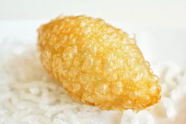 外層布滿勻稱的珍珠般的小泡泡,表示炸得到位,火候到家。