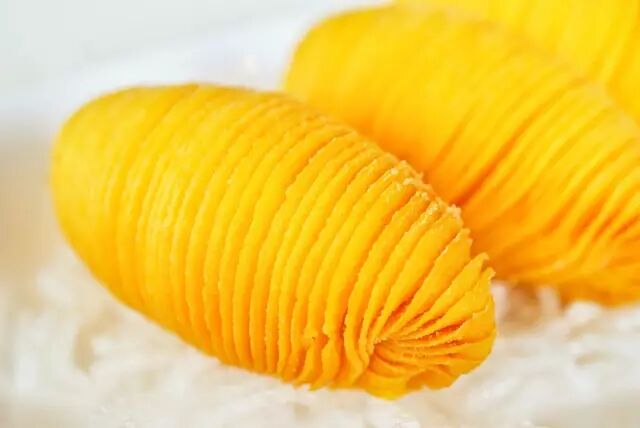 之所以叫蜂巢芋角,是因為它炸得夠身(粵語裏火候十足的意思),形如蜂巢。這要求油得一直保持在120度左右,油溫如果過高,芋角一下油鍋就會形成硬硬的脆麵,起不了酥脆的蜂巢。