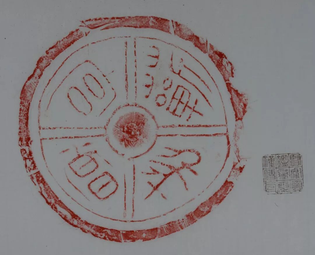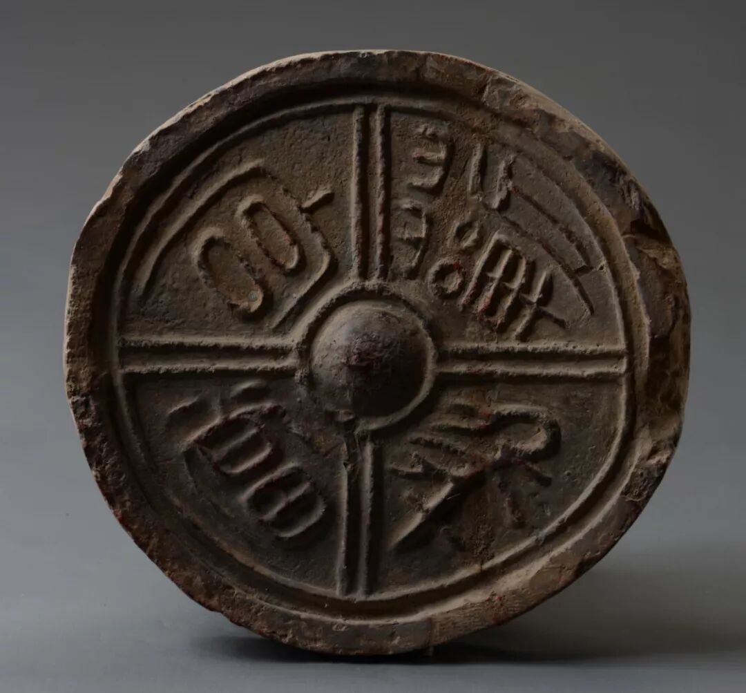 漢代倉廩用瓦。直徑十六厘米。中心圓內橫書“百金”二字,圓外雙欄四格界,其左右兩側格欄內各飾一蘑菇形雲紋,其上格欄內豎書“日入”二字,下格欄內橫書“米千石”三字,構思奇特。“日入百金米千石”,“石”,dàn,容量單位,十鬥為一石。此語直述出對財富的頌願。從字體上看,筆畫較為稚拙,隸書意味頗濃。出土於陝西省旬邑縣土橋村。
