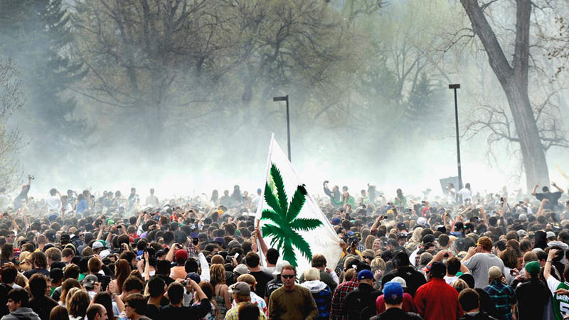 2010年4月20日,科羅拉多州博爾德地區。在大麻吸食者的慶祝活動中,大約12000至15000人聚集在科羅拉多州立大學呼吸大麻煙霧。(圖自網絡)