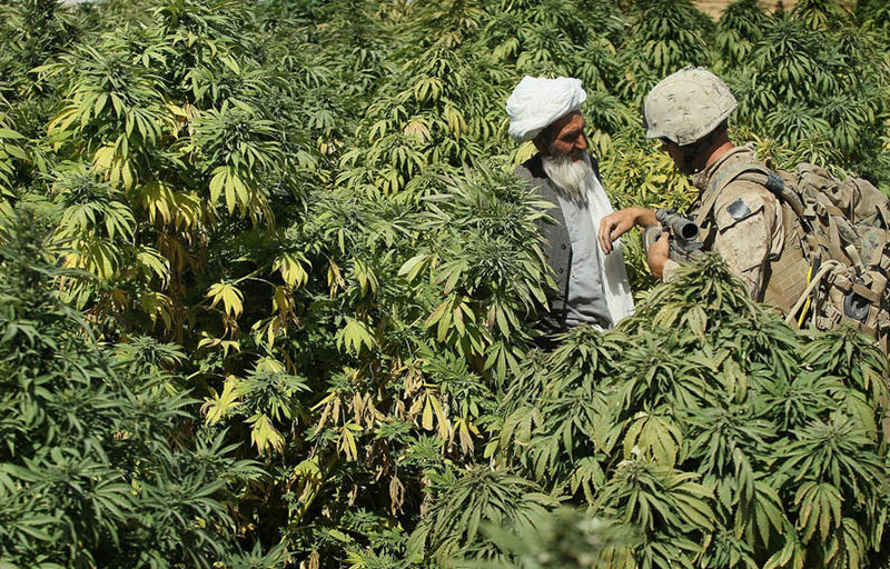 2010年10月10號,阿富汗的卡賈基附近的澤布呂赫。擔任巡邏任務的美海軍陸戰隊士兵正在盤問一個大麻種植者。(圖自網絡)
