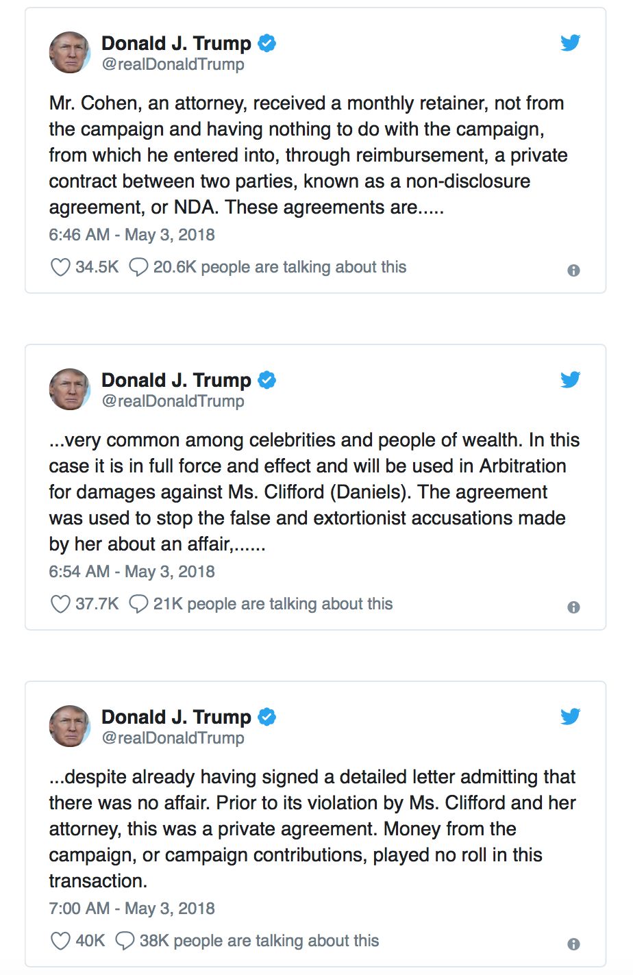特朗普總統今天(5月3日)一早也推文說,他的律師科恩經手了風暴姐封口之事,然後他本人以月費的方式將這筆錢償還給科恩。錢不是來自於競選團隊,與競選沒有任何關係。還說,這種做法在名人中是非常普遍的。