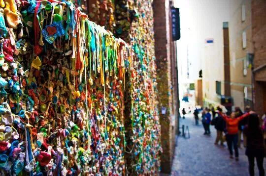 在派克市場我們還參觀了“全世界最惡心的網紅牆”—口香糖牆。口香糖牆的對麵是一家劇院,因為是在一條偏僻的小巷子裏,人們在排隊等候的時候,把嚼過的口香糖粘在對麵牆上,五顏六色的口香糖密集地以各種形狀黏在牆上,著實看著惡心反胃。