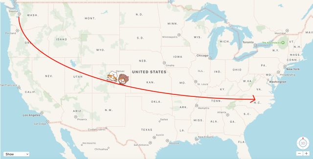 從Seattle, Washington乘坐飛機回到北卡大農村
