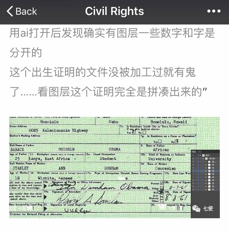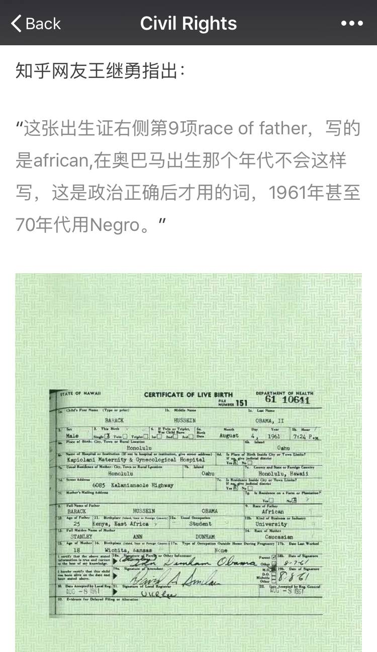 CR引用了一個重要的證據就是知乎網友,也是很多美國謠言認準的“假證據 ——認為“Race of father”在70年代應該被叫做Negro(黑鬼)。事實上,奧巴馬的父親是肯尼亞出生的,所以人種就被列為“African”(非洲人),和美國本土出生的黑人的叫法“Negro"不是一個意思[1]。