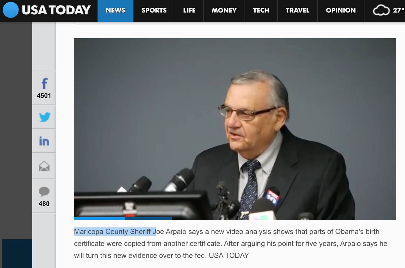 警長Joe Arpaio本人自稱“美國最牛逼的警長”,很早就是川普迷弟,也是個“出生證明陰謀”的主要活動家。他最早被茶黨雇傭專門去徹查奧巴馬出生證明的問題,該項目當時的負責人是Mike Zullo (此人專門搞了個組織叫Cold Case Posse去調查奧巴馬出生問題,還接受了不少捐款)。