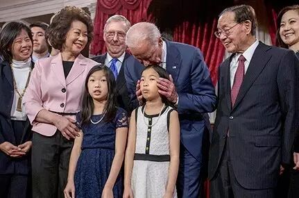 現任(民主黨)副總統拜登與趙小蘭一家合影(途中兩位女孩為侄女,右為趙錫成)