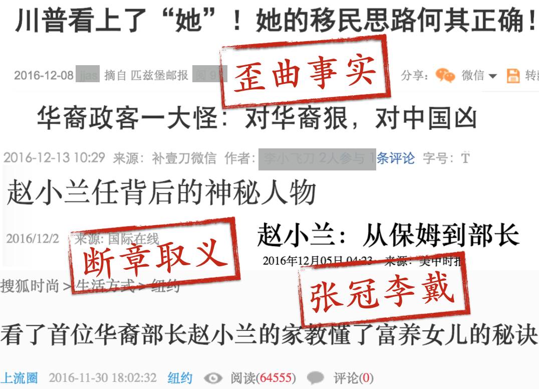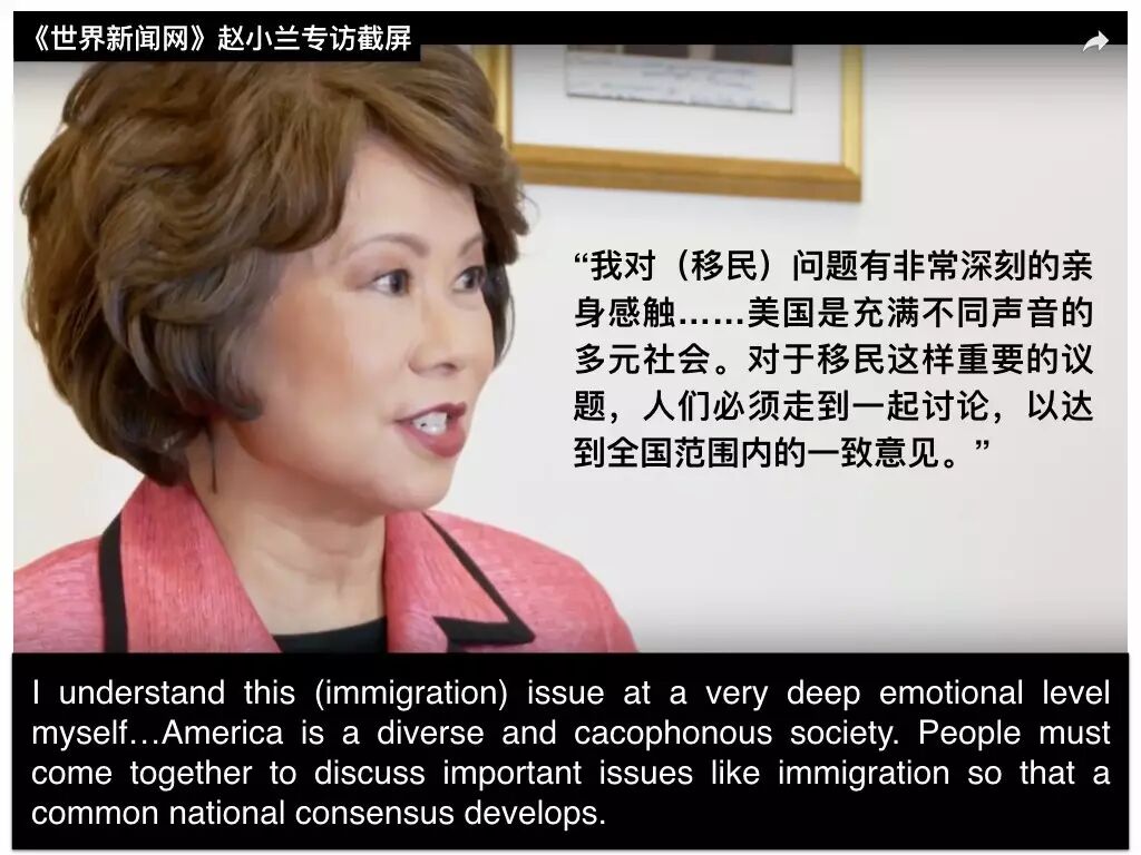 關於“非法移民(正確叫法是undocumented或out-of-status,而非illegal)”,趙小蘭的觀點並不是網絡上流傳的單純“抨擊白左、支持川普”。和許多背井離鄉的華裔一樣,從小移民到美國的趙小蘭,比任何人都更能理解新移民不顧一切要和與家人團聚,建立新生活的願望。她認為移民和大赦是要經過慎重討論的,也是跨黨派、跨族裔的重要問題,討論中亞裔的聲音也必須被聽到(6)。趙小蘭在勞工部長時期曾發話支持臨時工簽證,但是認為這種簽證不應成為獲取美國國籍的墊腳石 (7)。然而這些保守和中間派的公允看法,還是被居心叵測的網媒扭曲了。