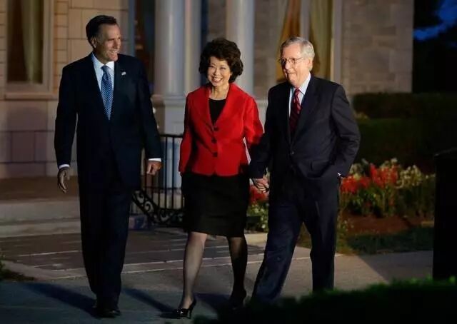 趙小蘭和丈夫麥康諾(左:前共和黨總統候選人羅姆尼)