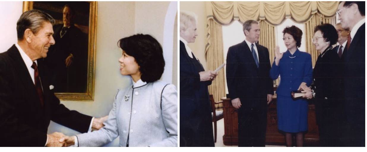 左:裏根接見“白宮學者”趙小蘭 右:宣誓成為小布什政府勞工部長的趙小蘭