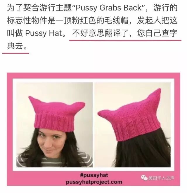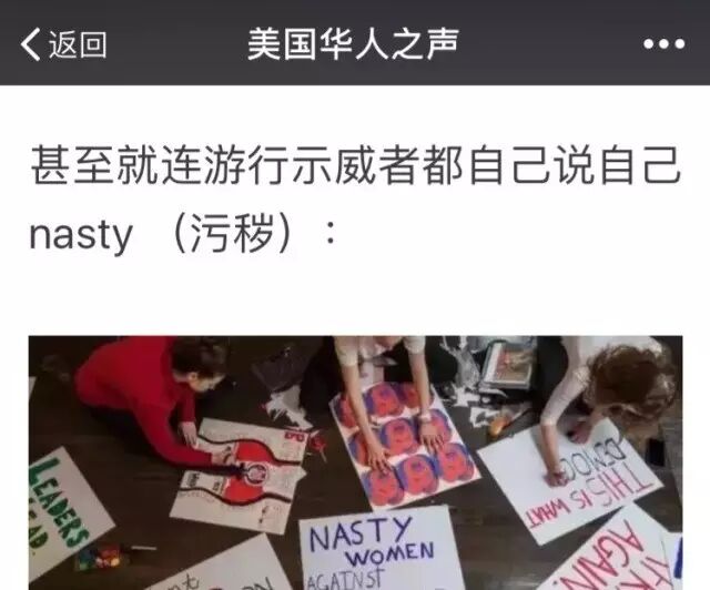 至於這個nasty women的梗,和pussy一樣,都是川普先說的。川普在全國直播的總統辯論中回罵希拉裏“這個汙穢的女人”(such a nasty women),所以不少參與者製作標語,以抗議總統貿然說出帶有攻擊性和性別歧視性的語言,竟被公眾號故意曲解成“示威者自己說自己nasty”。這些在美國路人皆知的梗,都要本寶寶費口舌來解釋(心好累),估計這位作者要麽住得是假美國,要麽對美國大選來龍去脈一無所知。