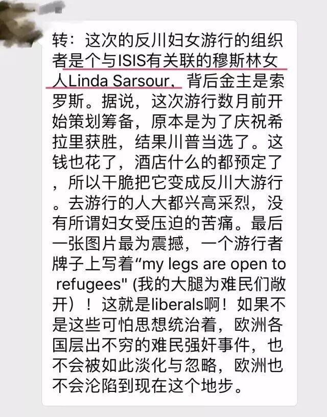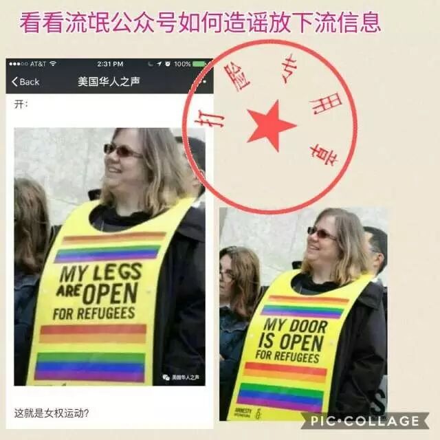 遊行的標語是每個人自己的觀點,難民的問題也是個大問題,示威者表示自己願意接納難民,是她個人的觀點。把一個標語的意見擴展到所有人身上,以偏帶全一次性打倒,挺川公眾號批鬥式的人身攻擊,這樣低級的修圖抹黑招數還在用,本寶寶都替你們著急,下次請先找一位技術過硬的美工吧。
