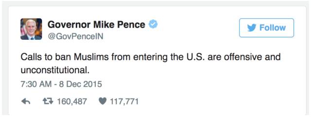 大家還記得不記得副總統Mike Pence還未被選為副總統時,代表建製派出來噴過“禁止穆斯林入境是非常冒犯的,也是違反憲法的”。