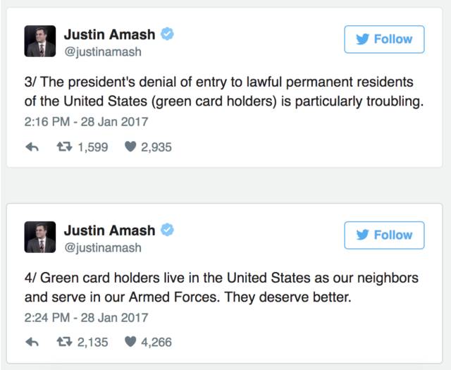 把Darweesh撈出來的有紐約州共和黨女議員Nydia Velazquez(波多黎各籍),此外僅有5名共和黨議員發聲反對該禁令(截至美國西岸時間1/28日下午6點)[6],其中密歇根國會議員Justin Amash還詳細在推特上列出了9個重點,解釋了該禁令的主要內容,其中第3、4點直接指出了綠卡和那些曾為美國軍隊工作過的人不應該被禁。