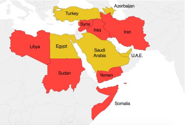 ▲bloomberg製作的示意圖,紅區為這次被禁止的穆斯林國家
