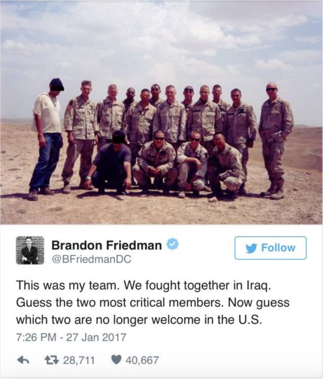 推特上鋪天蓋地的各種聲援,這條最令人動容。美國大兵的推特:“這是我當年在伊拉克的戰友們,猜猜最重要的兩名成員?再猜猜哪兩個不再被美國歡迎了?”
