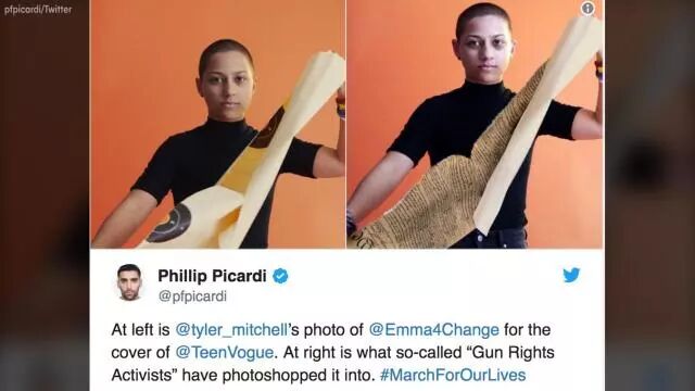 抹黑受害者的人到處散布謊言,一會兒說死去學生的家長是雇傭的演員,去遊行的學生也是演員;一會兒說學生是政府探員的兒子“眼線”,搞不好整場槍擊都是陰謀。他們甚至以拙劣手法給艾瑪·岡薩雷斯P圖,把她手撕槍支圖案的照片PS成“手撕憲法”。