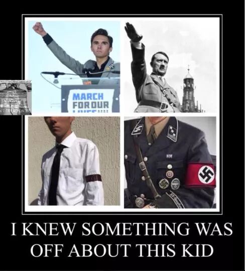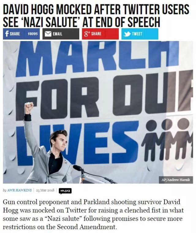 David Hogg,Parkland學生領導人之一。右翼媒體如Infowars, Breitbart將其妖魔化為“少年希特勒”的納粹軍禮: