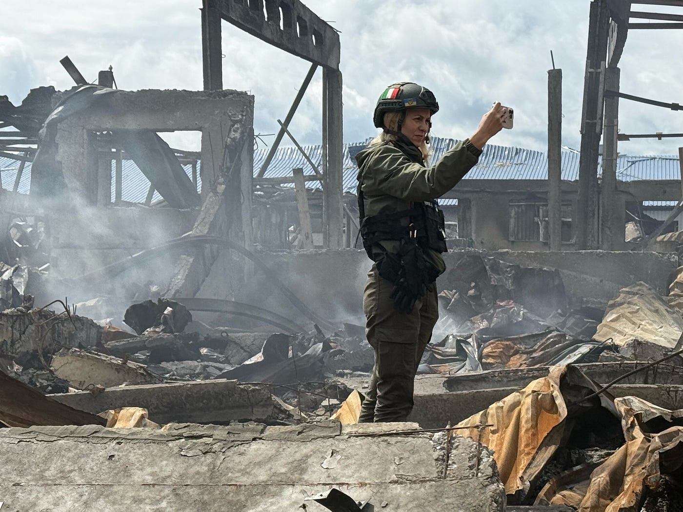 [圖:Alla在報道俄羅斯最近襲擊蘇梅民用工業的後果時。廢墟仍在冒煙版權所有,Giorgio Provinciali]