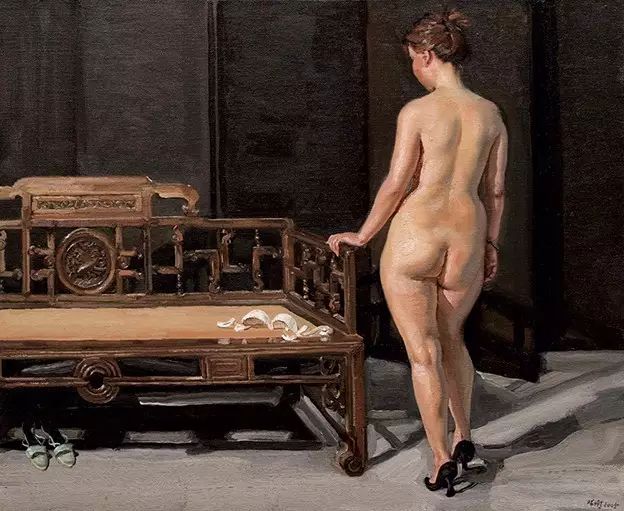 手扶羅漢椅的女人體