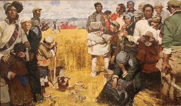 陳丹青被當做人才借調到西藏搞創作首次進藏。西藏對陳丹青有著決定性的影響。一是他找到了“文革”當中的一個特殊的題材—— 少數民族的題材。也為後來的1980年二次進藏創作《西藏組畫》奠定了基礎。二是毛澤東去世後,可以畫悲劇,可以畫人在哭。因為“文革”時不可以出現悲劇場麵,所有工農兵都要笑得紅光滿麵。因此,陳丹青早期的代表作 ——大型油畫《淚水灑滿豐收田》以及《進軍西藏》誕生,並於1977年分別入選《全國美展》、《全軍美展》。