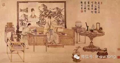 6.床頭邊放小幾一張。上放古銅花尊或者哥窯定瓶一隻,有花的時候將瓶裏插滿鮮花以收集香氣,平時則將蒲石放在上麵以收集清晨的露水,使眼目清爽。或者放鼎爐一個,用來焚燒印篆或燃香,冬天放暖硯爐一個。