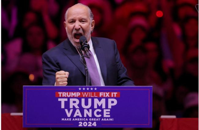 圖為2024年10月27日,盧特尼克(Howard Lutnick)在川普集會上造勢。盧特尼克於1961年7月14日出生於美國紐約州長島一個猶太家庭。在911襲擊事件中,包括他兄弟在內的658名員工喪生,而盧特尼克在隨後世界貿易中心雙子塔倒塌的事件中幸存了下來。從2019年開始,多次為川普舉辦了籌款活動從而贏得信任。(Reuters)