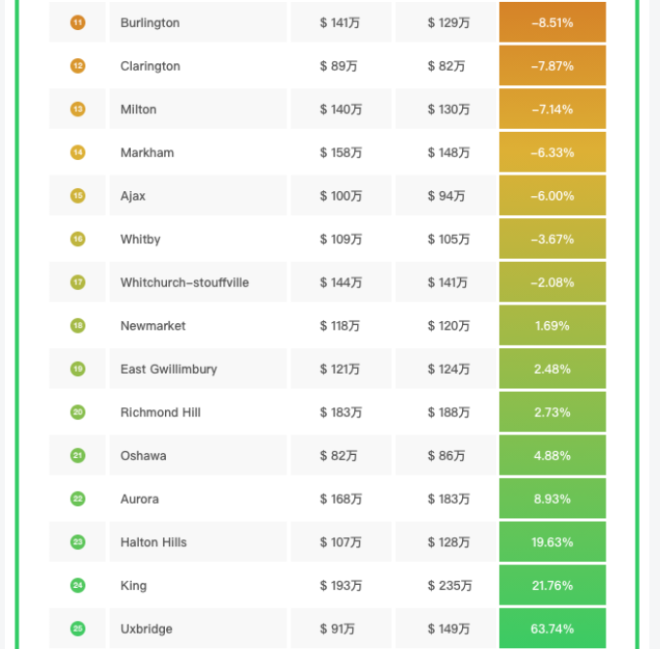 位居漲幅榜第一名的是Uxbridge,漲幅63.7%,其後是King和Haiton Hills,漲幅分別為21.8%和19.6%。