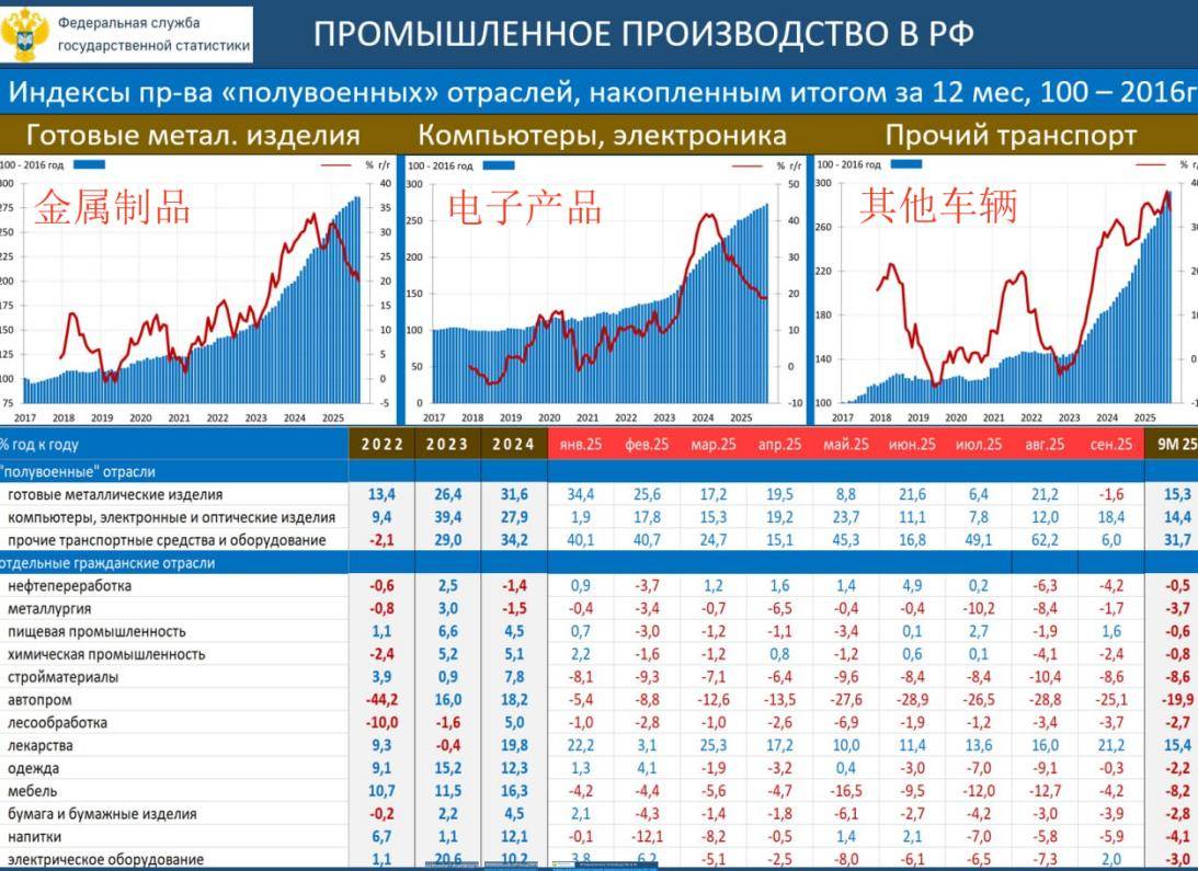 根據俄羅斯聯邦統計局的數據,2025年9月,金屬製品的產能竟然同比下降了1.6%。別小看這個數字,這可是自戰爭爆發以來,第一次出現負增長!