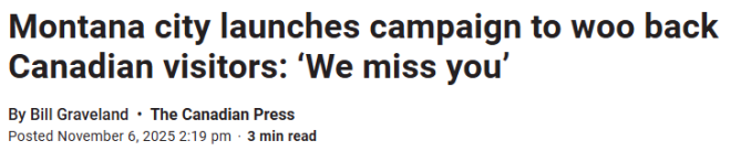 他表示:“在溫哥華,我們已經看到西雅圖、華盛頓中部和東部地區都在積極吸引加拿大遊客回訪。Kalispell的策略其實不新鮮——大幅折扣、加元等值匯率以及一些幽默的廣告活動......但據我們所見,這些活動尚未產生效果。”