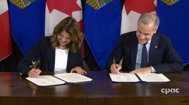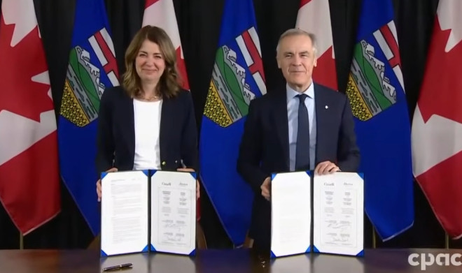 加拿大總理卡尼與阿爾伯塔省省長史密斯簽署了一項重大的能源合作協議,明確了在聯邦《重大項目法》框架下,若要批準一條通往太平洋的新輸油管道,必須滿足的減排及其他氣候條件。
